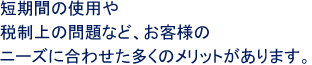 | 短期間から長期間まで、ご要望に合わせたリースシステムを採用しています。リース商品も多彩で、状況によりカスタムメイドのご要望にもお応えいたします。また、本体以外に、設備工事、備品、トイレなどのオプションまで、すべてに対応しますので、安心です。 |